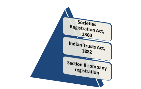| 1 | Statute/Legislation | Trusts governed by the Indian Trust Act, 1882. | Societies are governed by the Societies Registration Act 1860, which is an all- India Act. Many states, however, have variants on the Act. | Section 8 Companies are governed by the Indian Companies Act, 2013. |